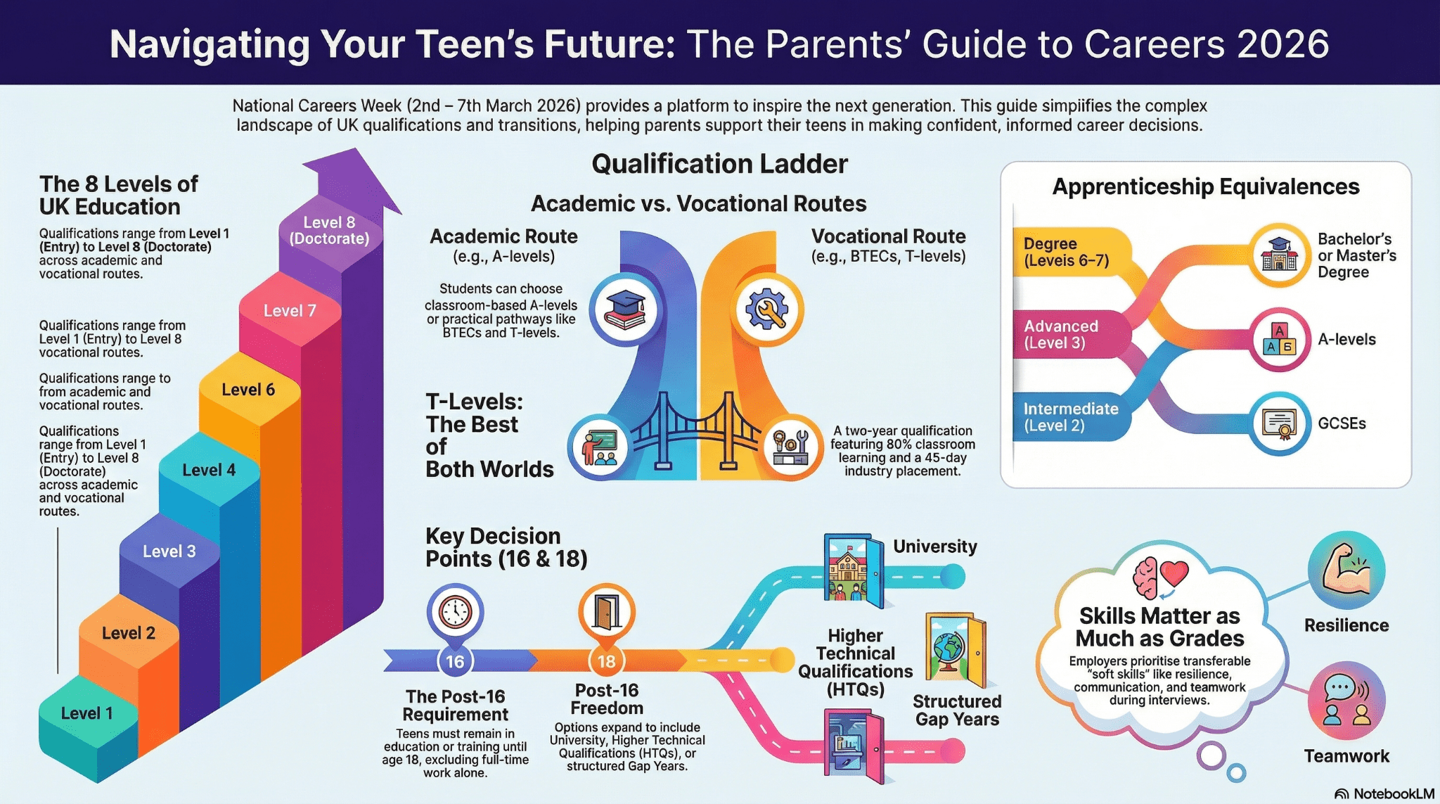 Post-16 pathways can feel complex, so taking time to understand them yourself can make a big difference. Options include academic routes like A-Levels, technical qualifications such as T-Levels, vocational courses like BTECs (transitioning to V-Levels from 2027), and apprenticeships that combine work and study. Each pathway suits different learning styles and career goals. By familiarising yourself with these options, you can help your child compare routes and consider what might suit them best. Resources such as The Parents’ Guide to Careers are especially useful in breaking down these pathways in a clear and accessible way.